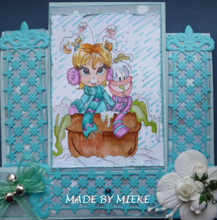 I coloured her with copics, and made an easelcard. I found in my stock a sentimentstamp, which I found very appropiate to this one. Lets hope, one day we'll find one!! Hope you all like it!